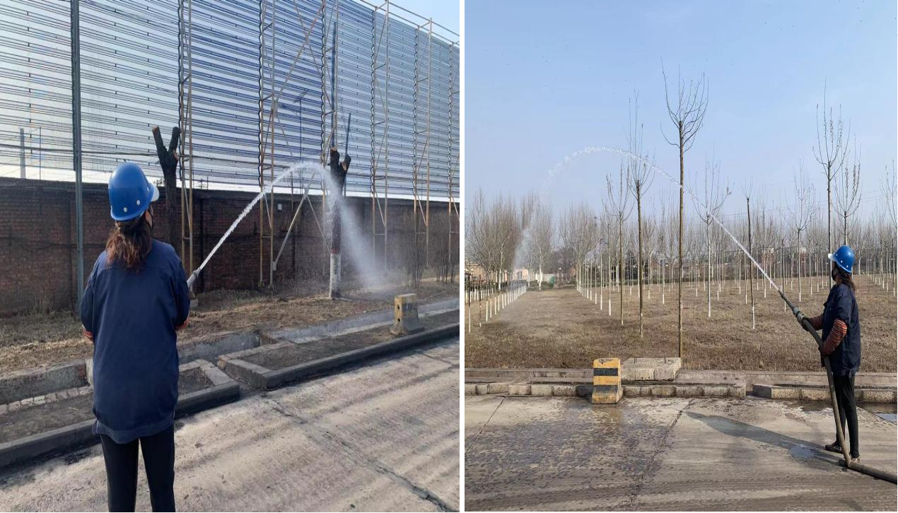 厂界道路护林组正在给树林冲洗和浇灌返青水