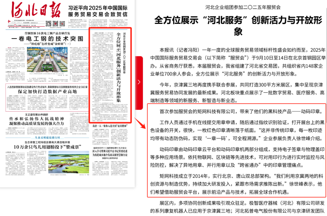 动码印章在展区全方位展示了其在央国企等领域应用的全场景安全防伪智慧印章解决方案,动态防伪码、动码印章机、物电一体化印控平台吸引了众多参会者驻足参观、研讨。服贸会河北省交易团领导、不同行业企业代表对动码印章表现出浓厚兴趣,详细分析产品功能、应用案例以及合作模式。动码印章展位更成为媒体聚焦的热点,河北日报记者现场观看了动码印章机的使用,并对企业参展负责人徐世峰进行了现场采访,“这并非传统印章,每一枚印迹均带有动态防伪码,真正实现‘一章一码’,可进行溯源识别印章、文件真伪。”徐世峰介绍,动码印章机配合物电一体化印控平台使用,可线上审批授权、线下物理盖印,解决了异地、多地同时用印、跨省通办中的印章管理痛点。
