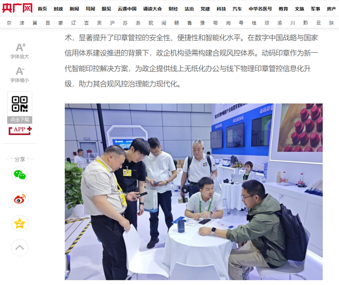 动码印章携全场景安全防伪智慧印章解决方案亮相峰会,动码印章向媒体分别展示了动码印章机、动态防伪码、物电一体化印控平台三大核心产品及在“全场景应用”、“防伪溯源、大众识别”和“印章分身术”的功能优势。第一,是实现“线上线下、物电同源全场景应用”,动码印章既能顺利获得平台在线上对电子文件签署,也可以顺利获得动码印章机线下在纸质文件上物理盖印,既满足了线上无纸化办公的需求,还兼容纸质文件上物理盖印场景,全面助力政企单位印章数智化升级。第二,在“动态防伪溯源、大众识别及数智化管控”层面,动码印章盖印每份文件都生成唯一动态防伪印迹,一章一码,印迹可识别、可溯源。动码印章动态防伪码核心专利,使用印信息和用印文件唯一绑定,用户顺利获得动码印章APP、微信和支付宝小程序扫描印迹,即可轻松溯源、辨别文件真伪,适合于证书、证照、证件、公文、合同用印,能有效打击假证、假章、假公文,杜绝人情章、空白章。第三,在“一机多章、多章一机印章分身术”维度来看,动码印章还具备一机多章、多章一机印章分身能力,打破传统锁住印章的设备与印章的固定绑定限制,大幅提升印章使用效率。动码印章机是拥有自主知识产权的新型印章打印机,采用国产核心零部件,集成国密算法,具备严格的身份验证与授权管理,既保证印章使用安全,又让用印灵活便携。一台印章机可以盖出无限量已授权印章,一枚已授权印章可以顺利获得多台设备多地同时盖出。
