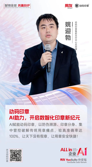 用友YonSuite分论坛上,动码印章售前交付中心总经理姚迎勃发表了题为《动码印章 AI助力开启数智化印章新纪元》的主题演讲,他深入分析了企业数智化转型过程中印章管理存在的核心痛点,并阐述了动码印章防伪溯源能力及智能化用章管理模式,AI技术在行业印章管理突破性应用。