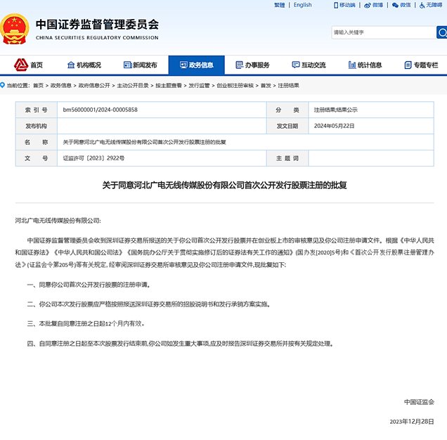 2023年12月28日,河北广电无线传媒IPO获证监会批准(发文日期2024年5月22日)。