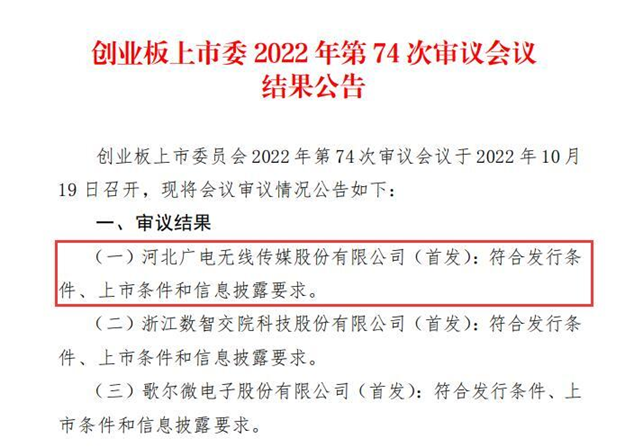 2021年10月22日,国家广播电视总局下发《关于同意河北广电无线传媒股份有限公司申请公开发行股票并在创业板上市的意见》(广电函〔2021〕177号),同意公司公开发行股票并在创业板上市。