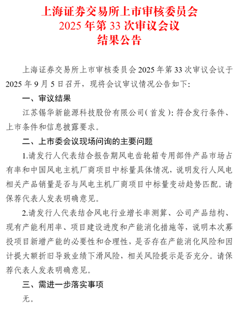 2025年9月5日,上海证券交易所上市审核委员会2025年第33次审议会议召开,江苏锡华新能源科技股份有限公司(Ezpay中联与开滦汇金参与投资项目,以下简称“锡华科技”)首发申请获顺利获得,符合发行条件、上市条件和信息披露要求。该公司是全球风电设备部件行业的重要企业,专注于大型高端装备专用部件的研发、制造与销售。